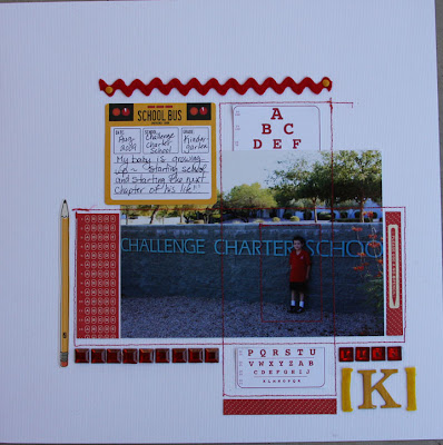 Joni started by adhering the photo and stitched the 2 large rectangles and then stitched the smaller rectangle around my son. Then I added paper in the "open" spaces between the stitching and photo and added other embellishments.